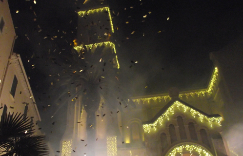 Le froid n'aura pas empêché des centaines de personnes à venir assister à cette inauguration féerique des Choeurs de Lumière devant le parvis de l'Eglise. Cela fait la cinquième année que la municipalité offre ce programme original d'illuminations et d'animations qui s'étalent sur plus d'un mois. Ferdinand Bernhard, maire, dira en souriant à l'assistance nombreuse: "je vous entends penser : pourvu qu'il fasse court!". Comme il est de tradition, le père Florian, le pasteur, le major Daniel Antommarchi dirent un mot à l'assistance. Ce dernier rappela que les sapeurs-pompiers fêteraient la Sainte Barbe le 4 décembre. Les élus, le représentant du commissaire Malléa étaient également à leurs côtés tandis que de nombreux bénévoles de Sanary Animation servaient vin ou chocolat chaud. Le maire eut une pensée pour les personnes dans la peine, et félicita notamment les électriciens pour leur travail, en précisant: "et comme nous sommes ambitieux, ce sera encore mieux l'année prochaine". La commune est illuminée de toutes parts : centre-ville, rond-point, le tout dans l'esprit du développement durable avec "l'utilisation de leds" comme nous expliquait Serge Loigne (responsable des animations). Le public ne fut pas déçu du spectacle, avec des embrasements spectaculaires, des lumières splendides accompagnées par l'organiste Pascal Marsault dont l'image était projetée sur une façade.