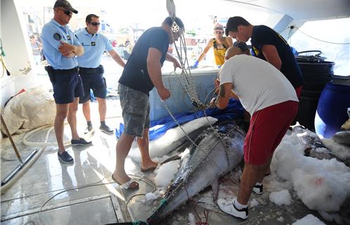 Avisée, la Brigade de Gendarmerie de Toulon (Brigade de Sécurité du Littoral) s'est rendue ce matin sur le quai du port pour le contrôle et la pesée. C'est non sans mal que le thon d'une longueur de 2,45 mètres a été accroché sur le portique arrière du bateau; la balance électronique accusait 216 kilos! Après le baguage, les gendarmes ont donné l'accord pour la vente. Vendu à un mareyeur de Sète et destiné à la restauration, c'est en camion réfrigéré que le Thonidé est parti "sous bonne glace".