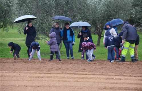 Ce monsieur n'est autre que Jean-Luc Granet, adjoint à l'environnement de la mairie de Sanary qui - accompagné de Christelle Massa, responsable de projets éducatifs du développement durable, ainsi que quelques parents et l'une des institutrices de l'école de la Vernette, Mme Bénabès - leur explique la vie de la vigne, la naissance du raisin, Pendant ce temps, un peu plus loin, d'autres enfants sont en train de planter des fèves, des haricots, des oignons... Hélas, la pluie revenant, les activités de plein air vont être écourtées et tout le monde rejoint le cabanon.