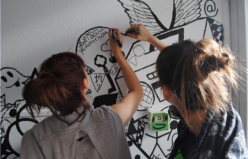 Deuxième volet des ateliers Arts Plastiques développés par l'association Artotaf avec les internes du Lycée de la Coudoulière, le mur du hall de l'internat a été décoré en noir et blanc.
