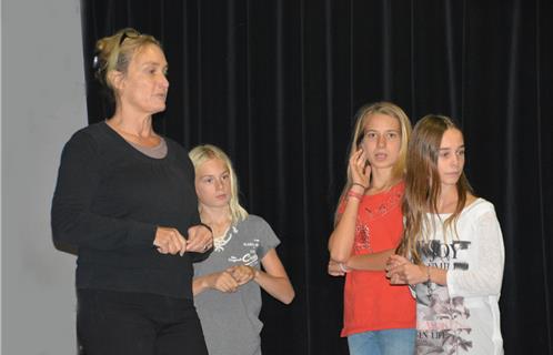 Mais du premier étage, descendent des voix. Atmosphère toute différente puisque, sur la scène et dans les gradins, une nuée de jeunes adolescentes de 8/9 ans, rient, crient, dansent courent... Ca n'en a pas l'air mais... elles travaillent, sous la houlette de Marie-Cécile Hermand, de l'association Artek.