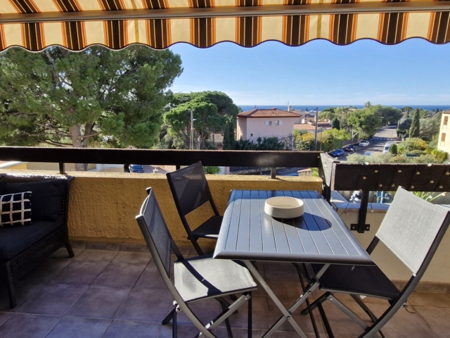 Il offre une pièce de vie lumineuse avec cuisine équipée ouverte sur le séjour, donnant accès à une terrasse de 10 m² bénéficiant d’une belle vue mer et dégagée.