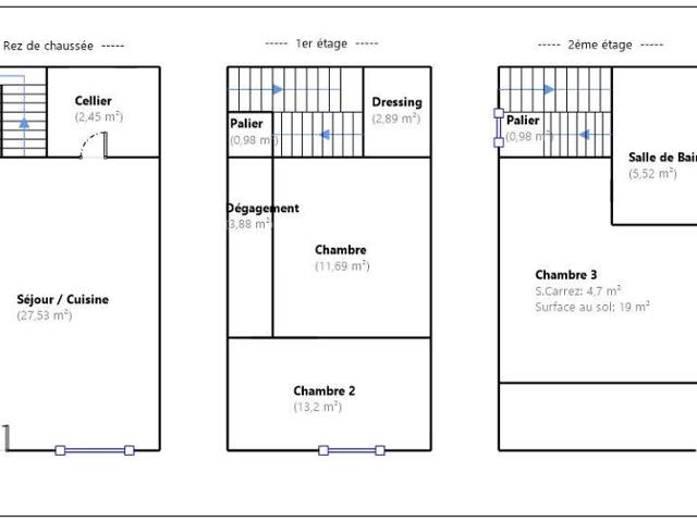 - À l’étage : une chambre de 12 m² avec dressing aménagé de 3 m², dont le puit de lumière sera refait pour la vente + une seconde chambre de 13 m².