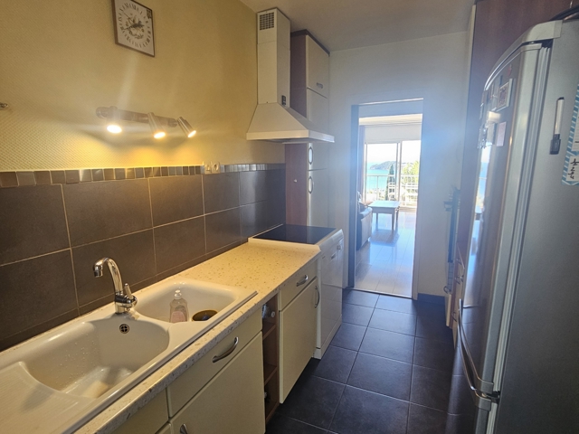 La cuisine aménagée et équipée dispose d’une loggia tournée vers la verdure — très pratique pour le quotidien et agréable visuellement.