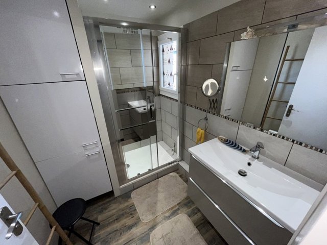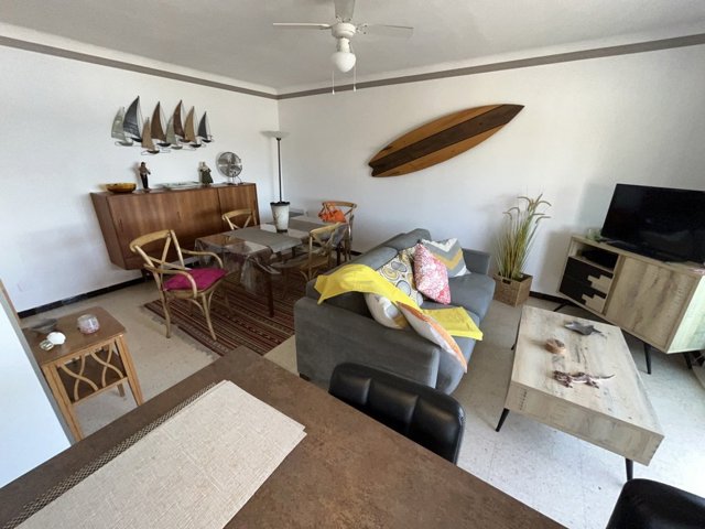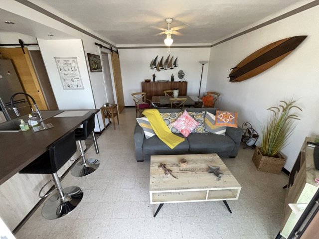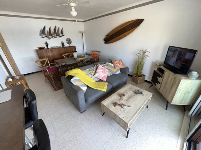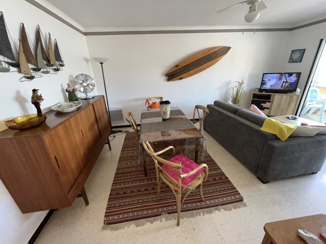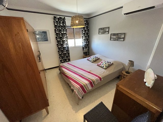 Situé au 2ème et dernier étage (sans ascenseur), T3 composé d'une entrée, un salon-salle à manger avec cuisine ouverte entièrement équipée, 2 chambres climatisées (l'une avec lit double en 160 et l'autre avec 2 lits simples en 90 + petite terrasse), une salle d'eau et un wc indépendant.