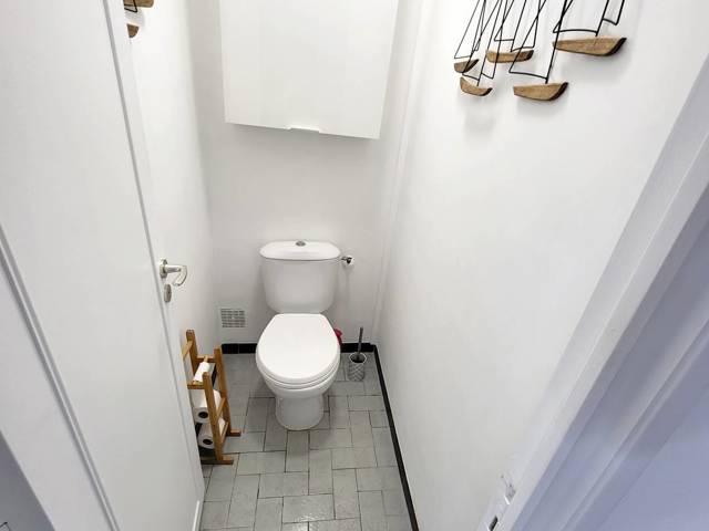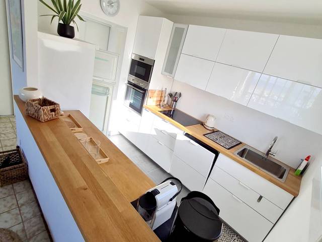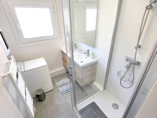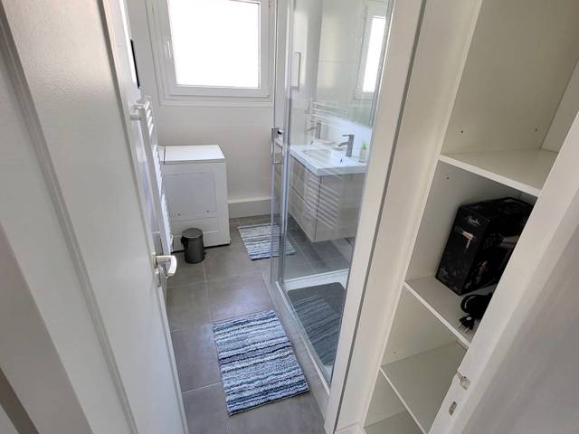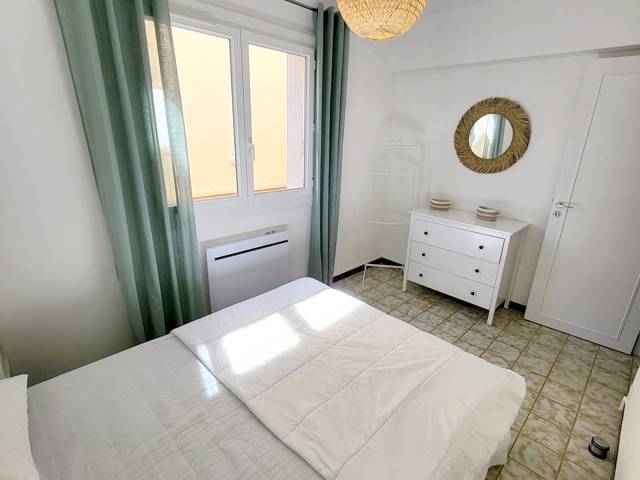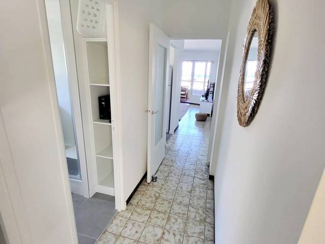 Loggia (12 m²) fermée par baies vitrées amovibles et avec table, chaises de jardin et store banne électrique - Entrée avec grand placard / penderie - Cuisine semi-ouverte sur le séjour (plaque de cuisson à induction 3 feux hotte aspirante - réfrigérateur / congélateur four micro-ondes - lave-vaisselle cafetière à dosettes Nespresso cafetière à filtre bouilloire - grille-pain table et fer à repasser aspirateur balai - extincteur) Pièce principale avec 1 canapé dangle convertible 1 place (en 140 x 190), téléviseur et ventilateur colonne 1 chambre avec 1 lit 2 places (en 160 x 200), armoire / penderie et lit de voyage pour bébé 1 chambre avec 1 lit 2 places (en 140 x 200) et commode Salle deau avec douche, double vasque, lave-linge, sèche-cheveux et sèche-serviettes électrique WC indépendant.