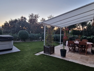 En rez-de-jardin, le premier appartement offre une vaste pièce de vie climatisée ouverte sur la terrasse et le jardin, une cuisine aménagée avec verrière, une chambre avec fenêtre, une salle d’eau et deux pièces sans ouverture extérieure. Le jardin privatif est agrémenté d’un jacuzzi, d’un barbecue et de deux cabanons.