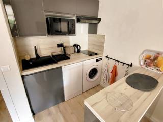 Loggia (10 m?) avec vue sur la verdure du domaine et ?quip?e d'une table, chaises de jardin, 2 transats, plancha et store banne ? Entr?e avec penderie - Cellier avec dressing, r?frig?rateur / cong?lateur , aspirateur, fer et table ? repasser - Cuisine ouverte sur le s?jour (plaque de cuisson vitroc?ramique 2 feux, micro-ondes, hotte aspirante, lave-linge, lave-vaisselle, cafeti?re ? filtre, bouilloire, grille-pain) - Pi?ce principale avec 1 canap? convertible Rapido 2 places (en 140), espace repas, chaine Hifi et t?l?viseur - 1 petite chambre avec 1 lit gigogne, soit 2 lits 1 place dont 1 matelas (en 80) et 1 matelas (en 70), petit climatiseur mobile et rangements - Salle d?eau avec douche italienne, vasque et s?che-cheveux - WC ind?pendants.
