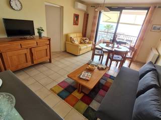 Loggia (8 m?) offrant une vue mer panoramique avec store banne, transats, table et chaises de jardin ? Entr?e avec cellier ?quip? d?une penderie / ?tag?res, escabeau, aspirateur, table et fer ? repasser - Cuisine ouverte sur le s?jour (plaque de cuisson ? induction 4 feux, hotte aspirante, four, micro-ondes, lave-vaisselle, cafeti?re Nespresso, cafeti?re ? filtre, bouilloire, grille-pain) - Cellier avec r?frig?rateur/cong?lateur, lave-linge et ?tag?res de rangement - Pi?ce principale vue mer avec 1 canap? convertible neuf 2 places (en 140 x 190), 1 canap? fixe, espace repas et t?l?viseur - 1 chambre vue mer avec 1 lit 2 places (en 140 x 190), t?l?viseur, armoire dressing et commode - 1 chambre avec 1 lit 1 place (en 90 x 190), armoire, commode et bureau - Salle de bains avec baignoire, bidet, vasque simple et s?che-serviettes ? 1 WC ind?pendant.