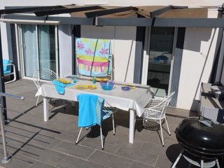 Grande terrasse avec une partie repas avec store (bâche coulissante).