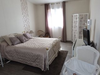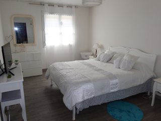 A l'étage, un grand hall de distribution desservant 2 chambres (l'une avec lit double en 160 ; l'autre est une chambre double avec lit double en 140 ouvrant sur une chambre d'appoint avec convertible en 120), une salle de bains et 1 wc indépendant.