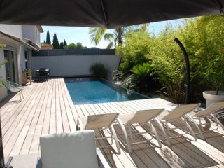 Villa neuve sur 2 niveaux avec superbe piscine à débordement, terrasse, jardin, barbecue, dans un quartier calme de Sanary sur Mer, à moins de 5 mn de la première plage de sable (plage de la Gorguette). Villa équipée de 3 chambres (6 couchages) avec chacune sa salle d'eau. Au rez-de-chaussée : Grande pièce à vivre comprenant salon-salle à manger avec cuisine ouverte entièrement équipée, une chambre, wc indépendant. A l'étage : 2 chambres et un wc indépendant.