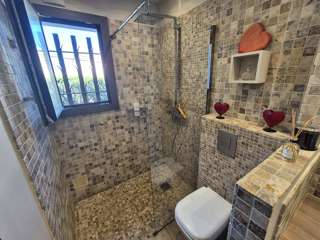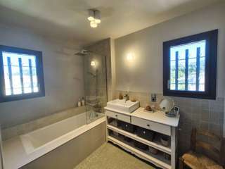 À létage, la villa dispose de trois grandes chambres climatisées confortables, chacune équipée dun lit double (140 cm), dune salle de bain et dun WC séparé.